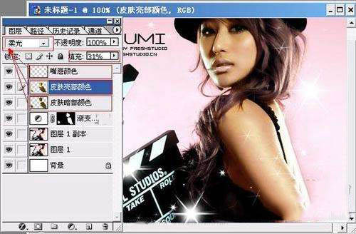 四.創建新圖層,用畫筆在皮膚處涂抹色澤(自己喜歡的顏色就好,但顏色要合理哦),圖層模式改為柔光,填充度為30%左右