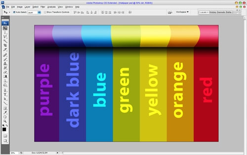 用同樣的方式添加5個不同顏色的線條。每行使用下列顏色:#0b7eb5,#9aa70e,#cfc211,#c3880a和#ae0617?,F(xiàn)在,我們得到了很棒的彩虹畫布。