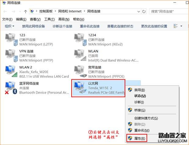 5、找到與設(shè)備相連的網(wǎng)卡,如果是無線網(wǎng)卡就選擇對(duì)應(yīng)的“WLAN”網(wǎng)卡。如是通過網(wǎng)線直連請(qǐng)選擇“以太網(wǎng)”。我這里連接的是“以太網(wǎng)”。右鍵點(diǎn)擊“以太網(wǎng)”選擇“屬性”。