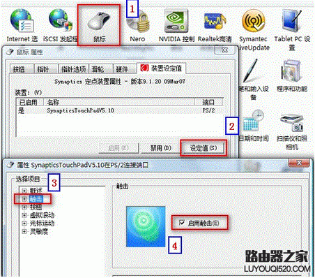 首先,進(jìn)入控制面板(右上角查看方式選擇大圖標(biāo))→打開鼠標(biāo)設(shè)置,然后根據(jù)對應(yīng)的觸控板品牌開啟觸擊,如下圖: