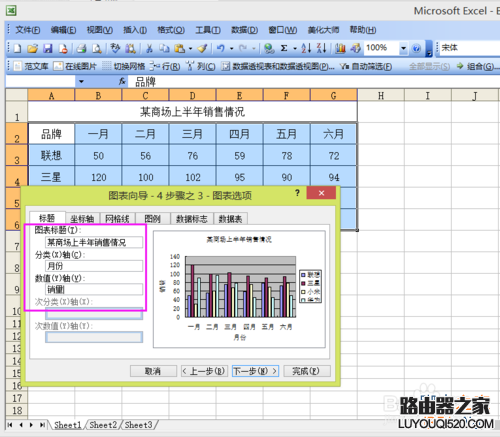 3、在圖表標題內(nèi)輸入相應的標題,X軸為月份,Y軸為銷量,預覽效果會在右邊顯示出來。