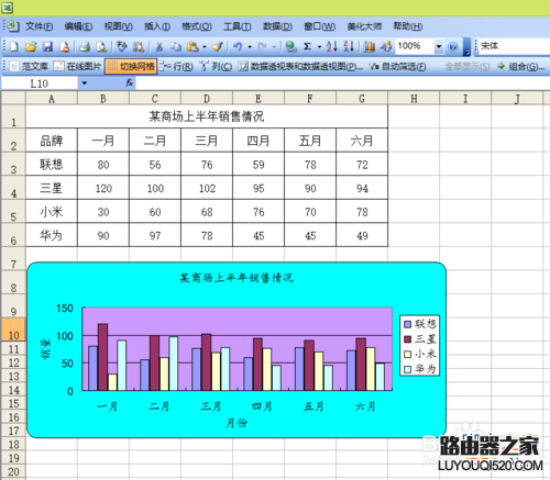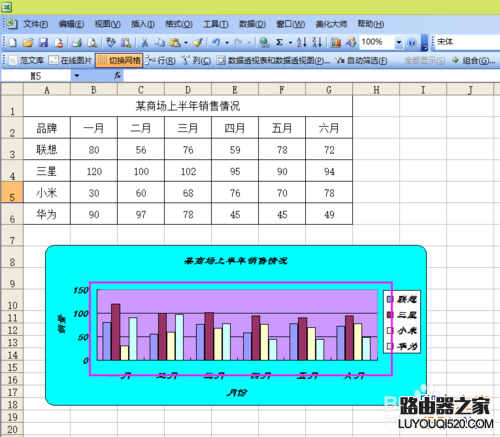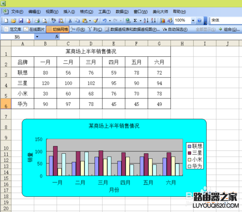 1、首先在我們制作出我們需要的表格,第一步選中數(shù)據(jù),不要選擇“某商場上半年銷售情況“這一單元格,因為它是已經(jīng)合并了的。