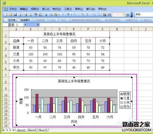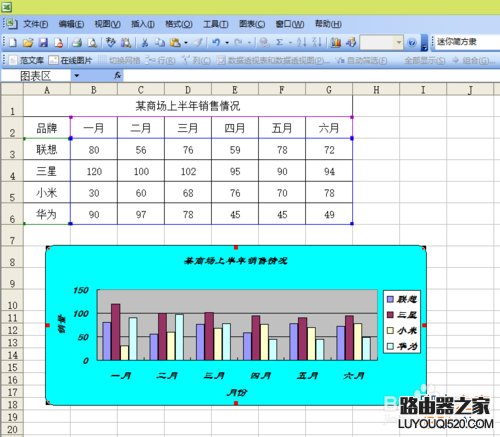 5、表格中數(shù)據(jù)的更改,圖表也隨之更改。我們可以試一下,把聯(lián)想一月份的銷量改為80,來看一下,圖表也隨之改成了80。這說明,圖表和表格之間是完全對應的。