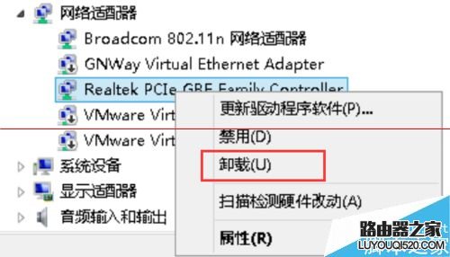 4、對著網(wǎng)卡點擊鼠標(biāo)右鍵將其卸載,并重新啟動計算機后系統(tǒng)會自動安裝一遍網(wǎng)卡驅(qū)動程序