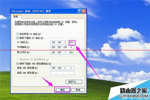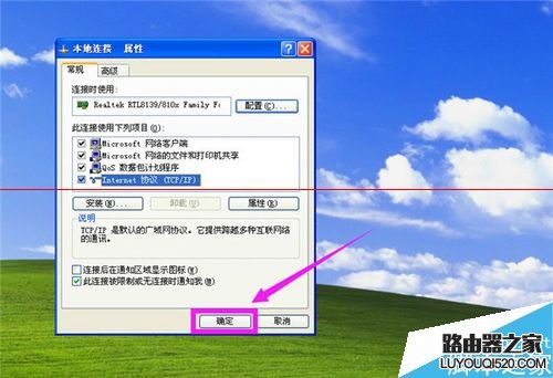 4、最后,在“本地連接 屬性”窗口中,點(diǎn)擊“確定”按鈕。完成IP地址的修改步驟。如圖