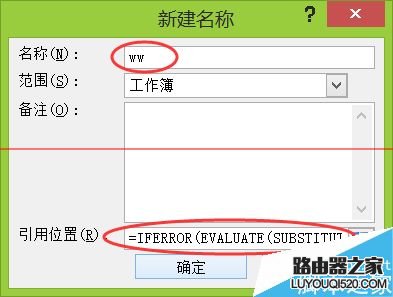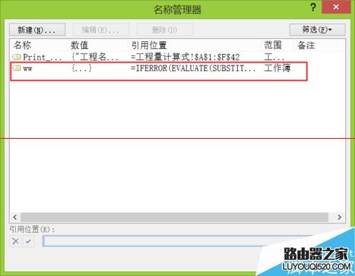 1、打開excel表,ctrl+f3彈出名稱管理器點擊新建彈出下圖,按圖寫上名稱ww,引用位置寫上 =IFERROR(EVALUATE(SUBSTITUTE(SUBSTITUTE(工程量計算式!F6,"[","*ISTEXT(""["),"]","]"")")),"")