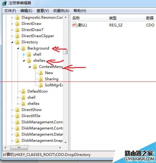 3、展開Directory,在其子目錄中依次展開Background,shellex,ContextMenuHandlers
