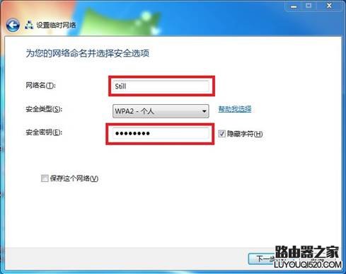 5. 輸入網絡名以及安全密鑰(推薦),并點擊下一步完;(此設置僅供參考)如圖1-6所示: