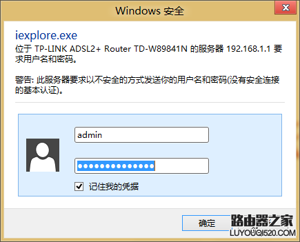 3.2 在彈出的 Windows 安全對話框,鍵入路由器的管理員賬號、密碼后點擊“確定”按鈕。如下圖所示: