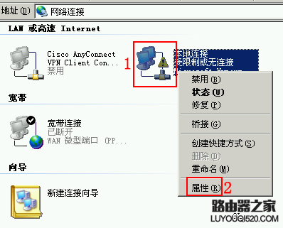 2.2 在彈出的窗口中,選擇對應的網卡名稱如本地連接,然后點擊鼠標右鍵并選擇菜單中的“屬性(R)”。如下圖所示: