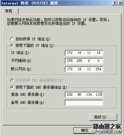 2.4 在彈出的屬性窗口,勾選“使用下面的 IP 地址(S)”,然后根據實際的網絡情況輸入 IP地址、子網掩碼、路由器網關地址和 DNS 服務器地址。如果不清楚需要設置什么值,可以聯系網絡管理員或者網絡服務提供商。確認無誤后,點擊“確定”按鈕。如下圖所示: