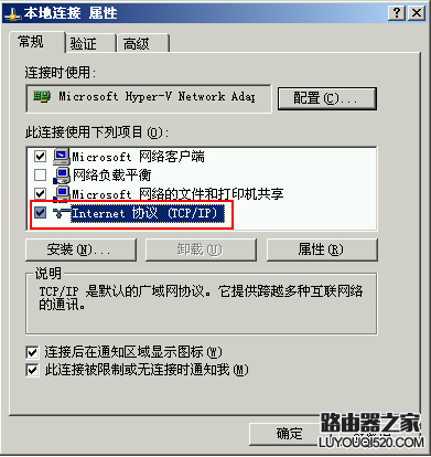 2.3 在彈出的本地連接屬性窗口,找到“Internet 協議(TCP/IP)”并雙擊鼠標左鍵。如下圖所示: