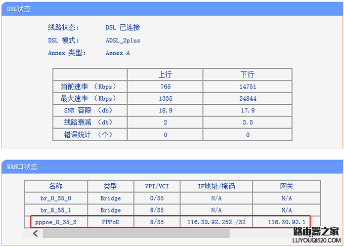 3.5 如果顯示未連接,如果確認 Modem 正常,且沒有欠費條件下,一般都是路由器的 WAN 撥號的用戶名、密碼輸入錯誤,或者 ADSL Modem 與路由器的連線錯誤、故障。
