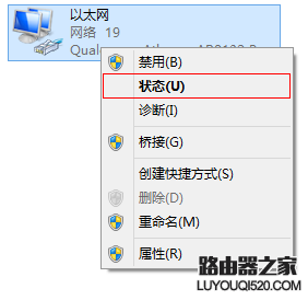 點擊桌面右下角的 網絡圖標,選擇 打開網絡和共享中心,點擊左上角的 更改適配器設置。找到 以太網,右鍵點擊并選擇 狀態。如下圖所示: