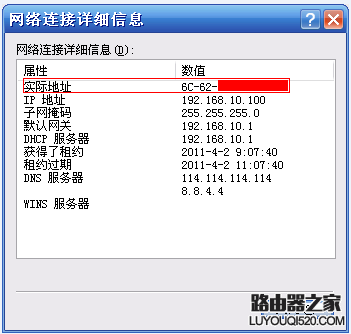 網絡連接詳細信息中的 實際地址 即為該有線網卡的MAC地址。如下圖所示: