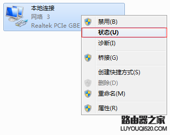 點擊桌面右下角的 網絡圖標,選擇 打開網絡與共享中心,點擊左上角的 更改適配器設置。找到 本地連接,右鍵點擊并選擇狀態。如下圖所示: