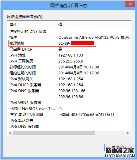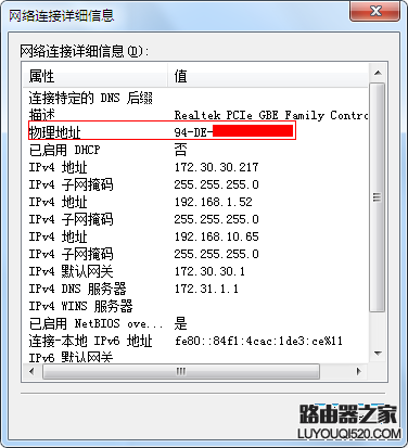 網絡連接詳細信息中的 物理地址 即為該有線網卡的MAC地址。如下圖所示: