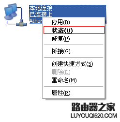 在電腦桌面找到 網上鄰居,右擊選擇 屬性,找到 本地連接,右鍵點擊并選擇 狀態。如下圖所示: