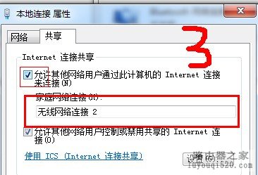 5、接在你的 連接網線的本地連接上 右擊懸著屬性 點擊“共享”這個選項卡 把第一項打鉤,然后選擇自己剛剛虛擬出來的那張 無線網卡,按確定就好了!
