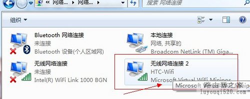 4、運行完命令以后,您可以在“網絡和共享中心-更改適配器”設置里面看到一個“Microsoft Virtual WiFi Miniport Adapter”設備。如圖2所示