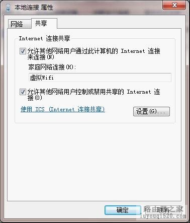 在“網(wǎng)絡(luò)連接”窗口中,右鍵單擊已連接到Internet的網(wǎng)絡(luò)連接,選擇“屬性”→“共享”,勾上“允許其他······連接(N)”并選擇“虛擬WiFi”。