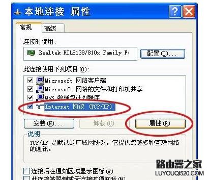 4、打開電腦,電腦桌面上的“網上鄰居”右擊,點“屬性”,打開“網絡連接”窗口,在這個窗口找到“本地連接”右擊,點“屬性”,在屬性窗口的“此連接使用下列項目”一欄選“Internet”協議(TCP/IP),點下面的“屬性”。