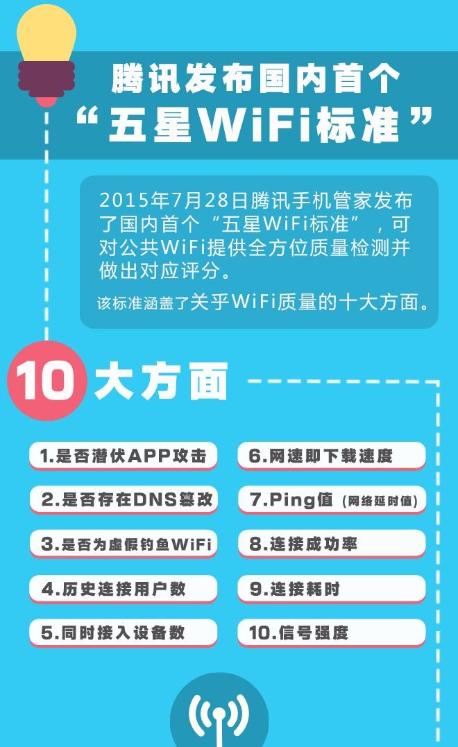 其實在2014年9月,騰訊就率先在業內聯合TOP10的商業WiFi服務商建立國內首個“安全WiFi聯盟”,希望將騰訊手機管家的WiFi安全防御能力輸出給合作伙伴,讓WiFi上網更加安全。不過安全只是WiFi上網用戶的痛點之一,想要解決五大痛點就必須要有更加完善的標準。