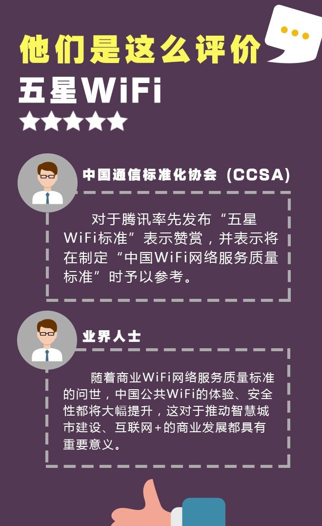 作為信息通信行業技術標準組織的中國通信標準化協會(CCSA)明確表示,將在指定“中國WiFi網絡服務質量標準”時,參考騰訊“五星WiFi質量標準”的相關數據維度。
