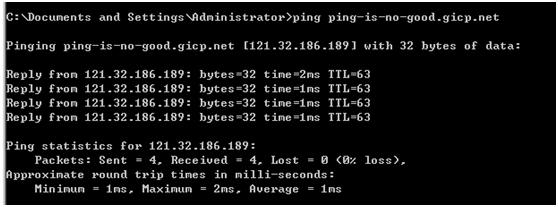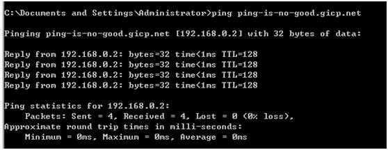 這種時(shí)候你要做的就是把本機(jī)DNS服務(wù)器設(shè)置為當(dāng)?shù)刈罡咝У腄NS服務(wù)器,你可以直接撥打你的寬帶接入商的服務(wù)電話詢問并把問到的高效DNS地址設(shè)置到你的電腦上即可。例如將電腦的主DNS從202.96.128.86改為 202.96.128.166,然后用命令” ipconfig /flushdns”清除本機(jī)DNS緩存后,再ping ping-is-no-good.gicp.net,結(jié)果正確,如下圖所示: