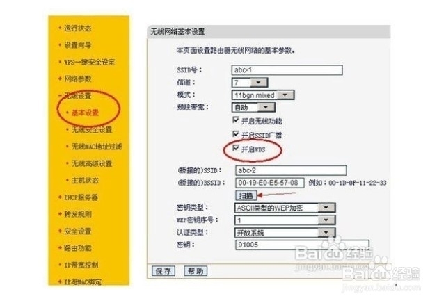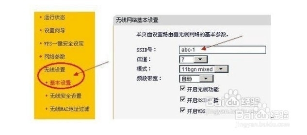 3.在路由器設置菜單左側選擇無線設置的基本設置,右邊的SSID號里面填上自己起的名字。注意,這兩個路由器的名字要不同,例如一個叫abc-1,另一個叫abc-2 。此外,這兩臺路由器的信道也必須相同;并選擇開啟無線功能和開啟SSID廣播(這些本來都是默認開啟的)(如下圖),選好后點“保存”。