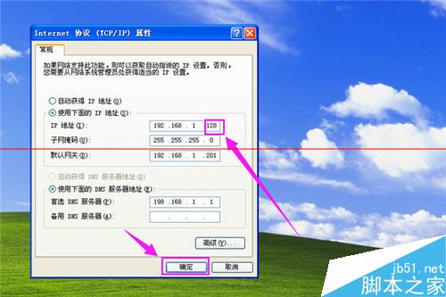 3、在Internet 協議(TCP/IP)屬性窗口中,更改IP地址的最后一個數。可改為1~255之間的任何一個數。改好后,點擊確定。如圖
