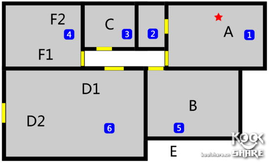房子是高層,面積比較大,紅色五角星為無線路由器安置的部位,藍色數字標簽處為信號測試點