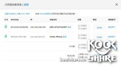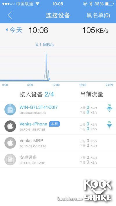 連接設備標簽頁,可以看到當面的連接設備和實時流量,針對單個設備,可以設置上限提醒和限速,可以添加黑名單和從黑名單中移除。