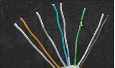 2、剝除外包皮即可見到雙絞線的 4 對 8 條芯線,并且可以看到每對的顏色都不同。先把 4 對芯線一字并排排列,然后再把每對芯線分開,并按從左到右:白橙、橙、 白綠、藍(lán)、白藍(lán)、綠、白棕、棕的順序排列(這種排列稱為 568B 排序)。然后 用網(wǎng)線鉗垂直于芯線排列方向剪齊。