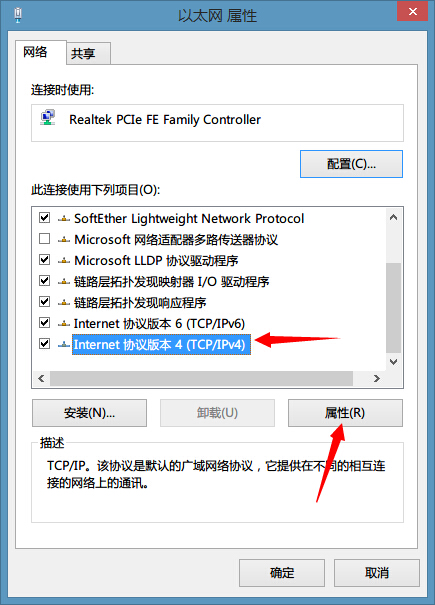 4.選擇中Internet 協議版本 4 (TCP/IPv4),再單擊屬性。