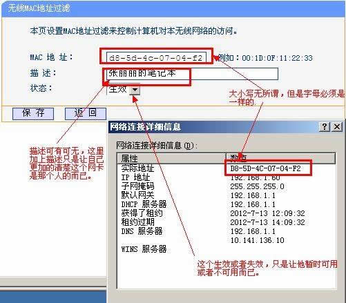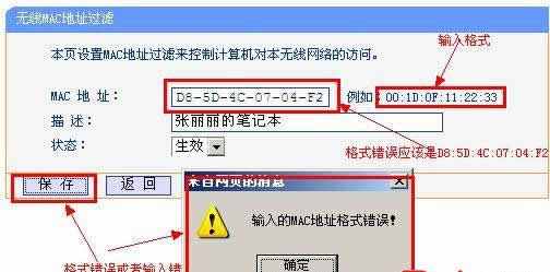 注意:以上圖設(shè)置格式不對(duì),因?yàn)槁酚善鞯牟煌湓O(shè)置MAC網(wǎng)址的格式也不一定的。具體可以看他例如:后面寫(xiě)的格式。所以d8-5d-4c-07-04-f2格式是不對(duì)的,應(yīng)該是d8:5d:4c:07:04:f2才對(duì)的。否則連保存都做不到的。