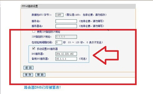 3、如上圖,我們再點擊路由器WAN口設置界面底部的“高級設置”,如下圖箭頭所指位置。點擊高級設置后,即可進入路由器DNS設置界面了,如下圖:
