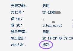5. 按F5刷新網頁查看路由器運行狀態,當WDS狀態顯示為“成功”就一切OK啦!