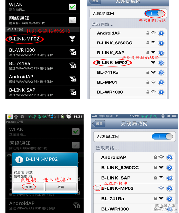 ②、找到要連接的SSID(比如本例當中的B-LINK-MP02),并連接它。如下圖: