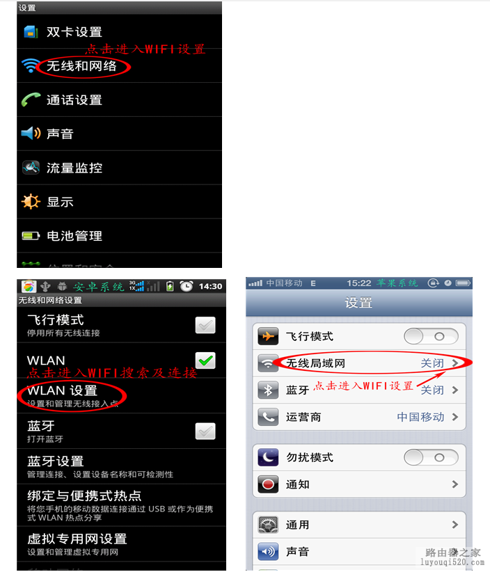 ①、從手機菜單項的“設置”項,開啟手機中的無線WIFI設置項,進入無線搜索列表中。如下圖: