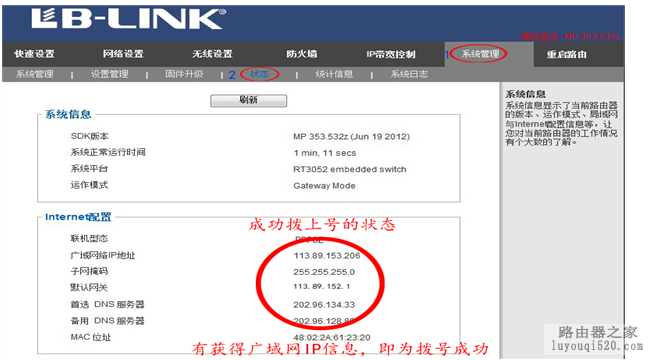 注:此處獲得的廣域網IP信息是動態的,只要有獲得IP信息即可,不用管是多少。若未獲得廣域網IP信息,請核對PPPOE中填入的上網帳號和密碼的正確性