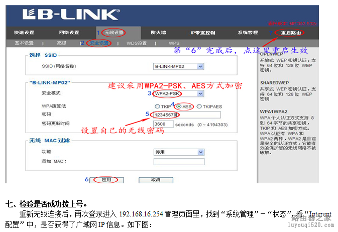 找到“無線設置”-“安全設置”,安全模式選“WPA2-PSK”,WPA算法選“AES”,密碼在8-15位之間(密碼太長,在無線連接時容易出錯),設置好后,點“重啟路由”讓路由器生效。如下圖: