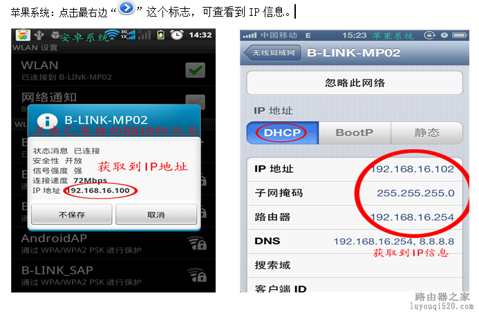 安卓系統:點擊已連接上的SSID(本例中的MP02),就會出現如下圖IP地址信息;