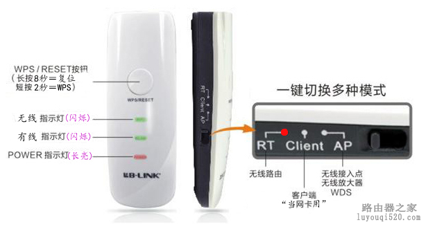 接入電源到MP01后,路由器上WIFI指示燈是否有閃爍(大約1秒閃爍一次)。當網線接入網口后,路由器上WLAN指示是否有亮或閃爍,若不亮,則表示為線路不通,請重新接入網線或更換網線或重作水晶頭。指示燈狀態及模式選擇說明如下圖:
