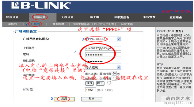 找到“網絡設置”-“廣域網”,在廣域網模式中選擇“ADSL虛擬撥號(PPPOE)”這項,在下面填入自己寬帶上網帳號和密碼(也就是原電腦上網時“寬帶連接”里的用戶名和密碼),此處一定要填入正確,否則,路由器不可能撥上號。如下圖: