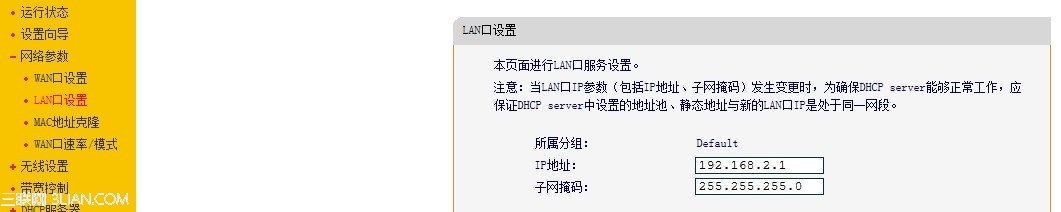 然后點(diǎn)【LAN口設(shè)置】,把右側(cè)的IP地址改成192.168.2.1,點(diǎn)保存。