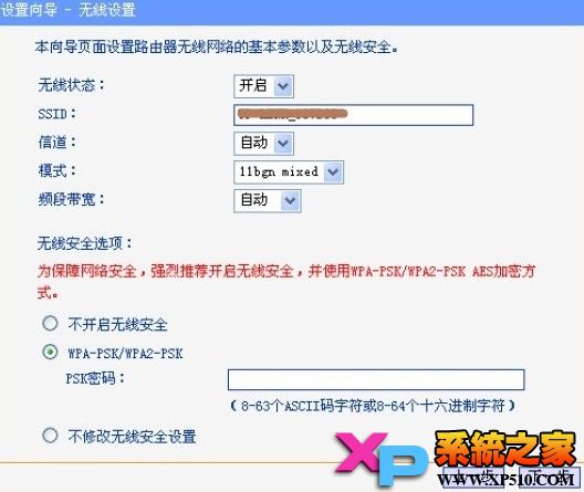 5、進入無線設置界面。無線狀態選擇“開啟”;SSID根據您的喜好設置,就是給您的無線網絡起個名字。其他部分無須設置;無線安全選項選擇WPA-PSK/WPA2-PSK,密碼需要8位以上,建議盡量設一個不容易被猜到的。