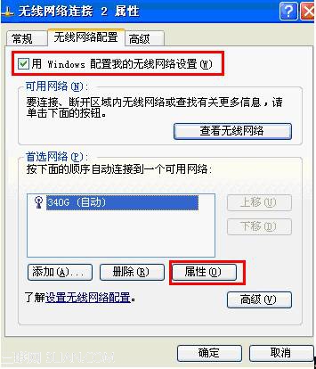 3. 在“無線網絡配置”中”首選網絡”選擇所要連接的網絡,點擊“屬性”。