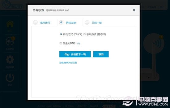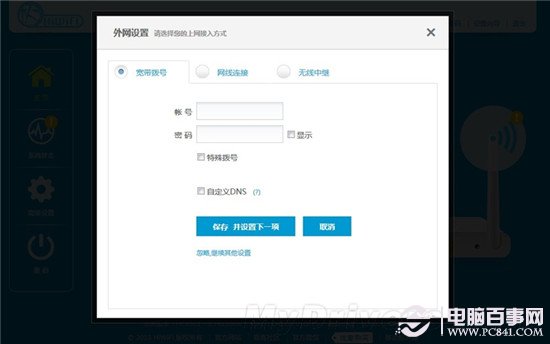 第一步便是設(shè)置上網(wǎng)方式,有“寬度撥號”“網(wǎng)線連接”和“無線中繼”三種外網(wǎng)連接模式。