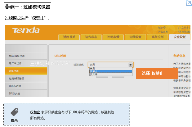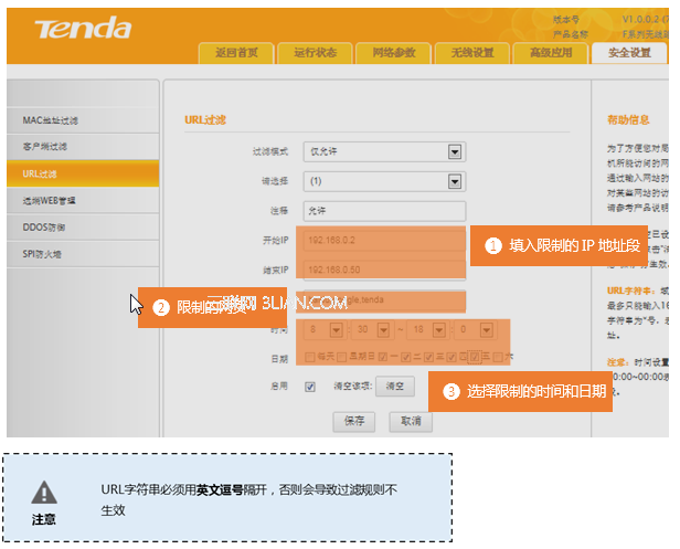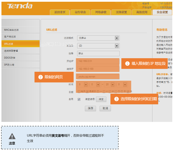 在登錄到路由器管理界面后,在安全設(shè)置 的 URL過濾 界面中來實現(xiàn)限制一的條件: